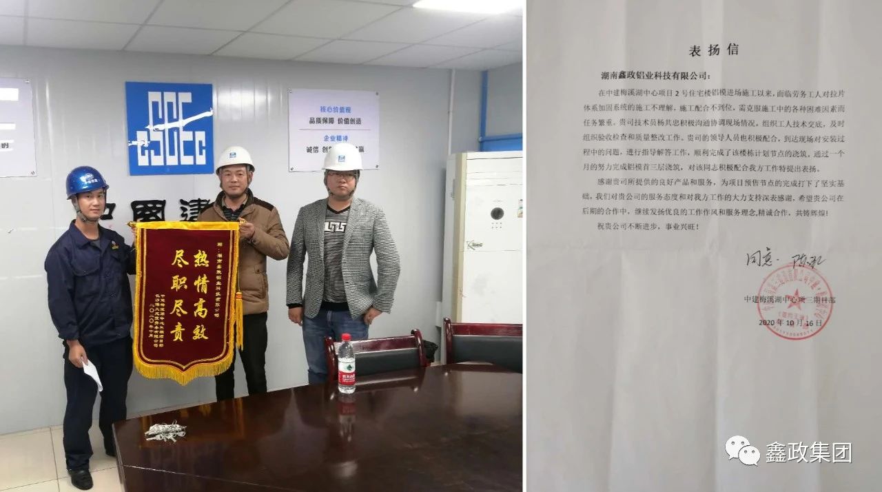 近日,中建五局第三建设有限公司中建梅溪湖中心项目部和现场劳务公司长沙博大建筑劳务有限公司送来锦旗和表扬信,对91香蕉视频下载安装铝业技术服务科杨共忠在项目上的出色表现给予了充分肯定和高度评价。